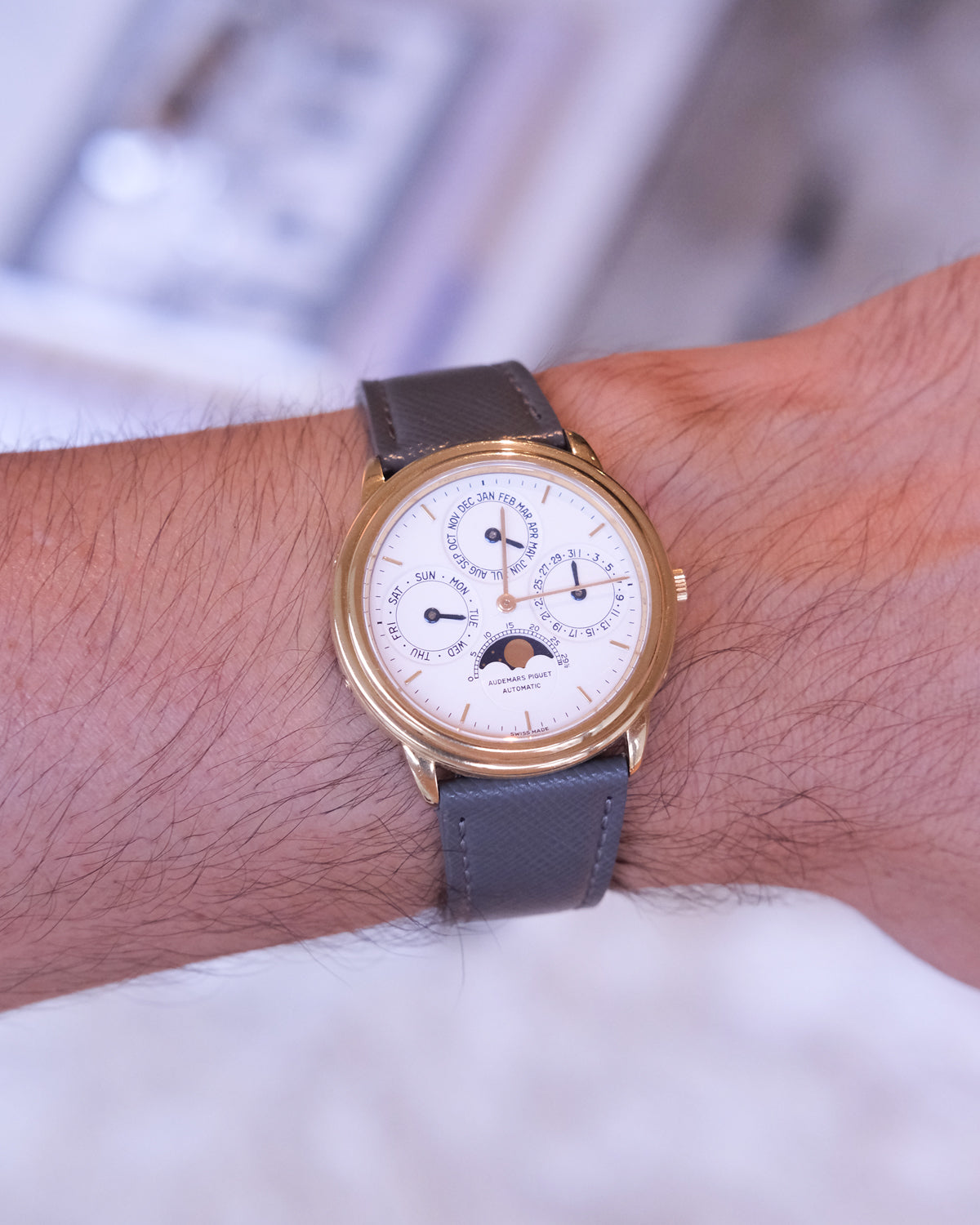 Water can damage a leather watch strap and cause it to stain, discolour or deteriorate prematurely. If you do get your leather strap wet: gently brush off the water using a soft, absorbent cloth, and then let it dry naturally.